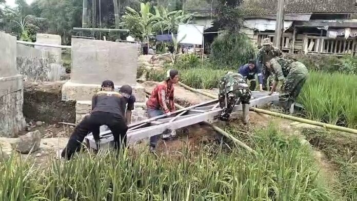 Pacet, Kab. Bandung – Mimpi masyarakat Kampung Rumbia dan Kampung Cibutak di Kecamatan Pacet, Kabupaten Bandung, untuk memiliki akses penghubung yang lebih baik semakin mendekati kenyataan. Pembangunan Jembatan Gantung Perintis Garuda Tahap II, yang melintasi derasnya aliran sungai Citarum, terus dikebut dan menunjukkan progres yang menggembirakan. Pada hari Selasa, 03 Maret 2026, anggota Koramil 2416/Pacet Kodim 0624/Kab. Bandung, bahu membahu bersama Tim Asnik Puziad, para tukang ahli, dan warga setempat, kembali melanjutkan pengerjaan jembatan yang sangat dinantikan ini.