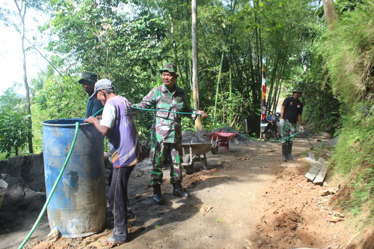 Di bawah terik yang mulai meninggi, personel Satgas bahu-membahu memastikan suplai air tetap lancar agar proses pengadukan material berjalan optimal. Aliran air yang mengucur deras seakan menjadi simbol mengalirnya harapan baru bagi warga Desa Somagede.