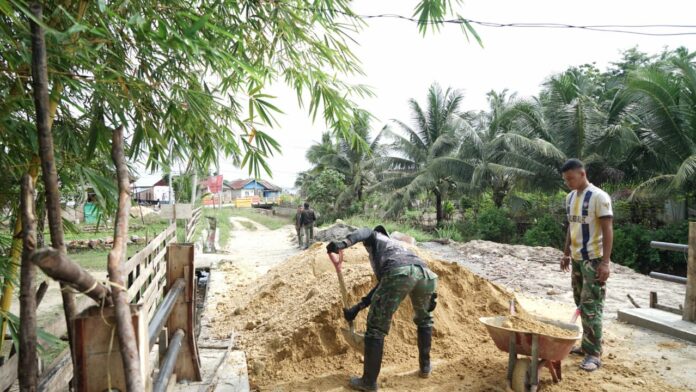 Pada Selasa (3/3), para prajurit bersama warga setempat fokus melaksanakan pengerjaan penimbunan jalan penghubung jembatan.