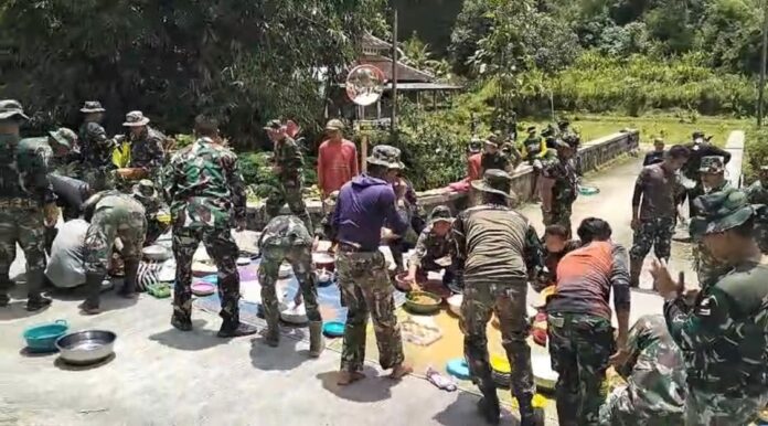 Momen makan bersama nasi kondangan/bungkus menunjukkan kekompakan, di mana warga secara swadaya menyiapkan makanan untuk prajurit yang bertugas membangun infrastruktur desa.