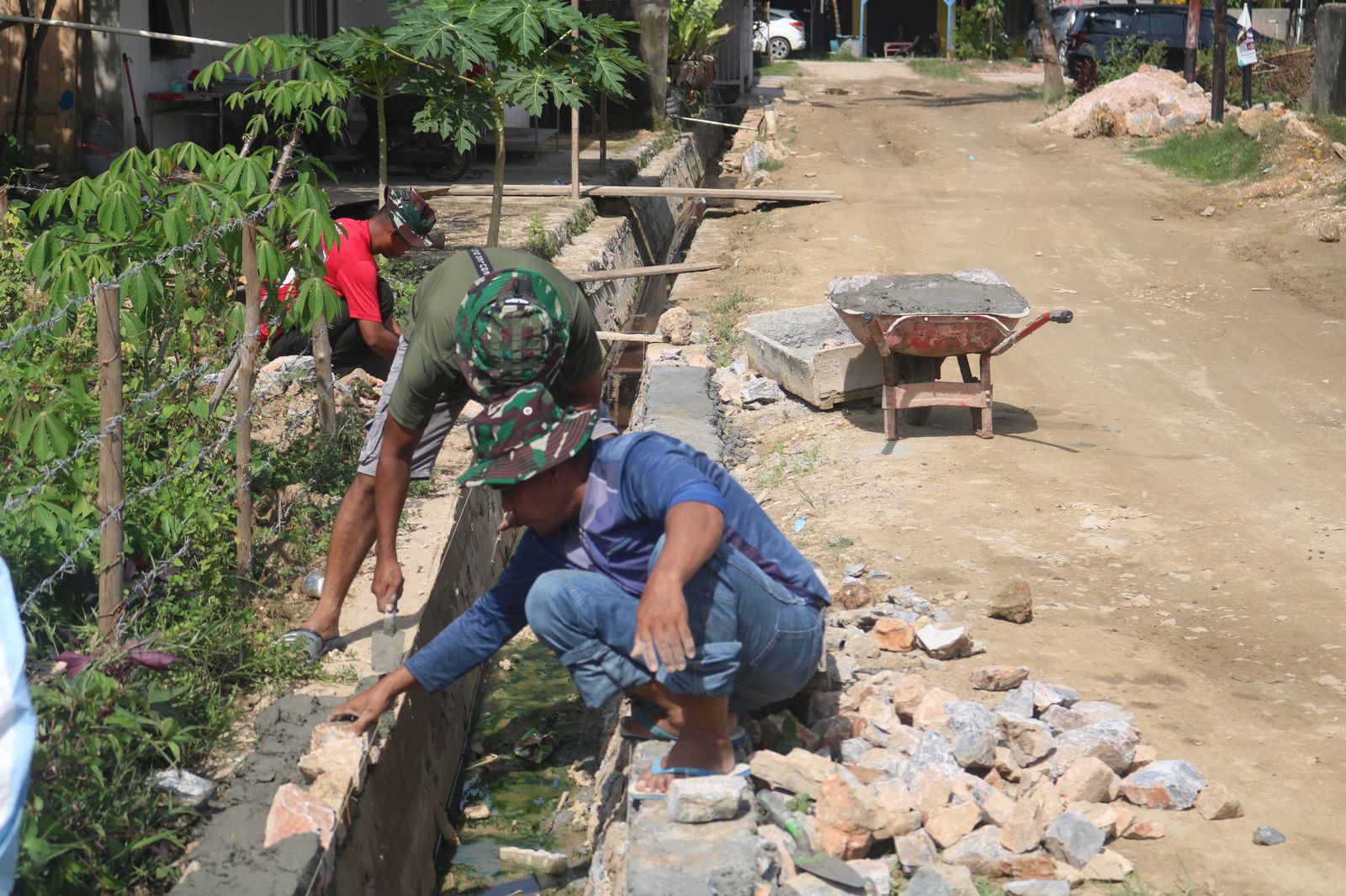Dalam aksi gotong royong tersebut, prajurit TNI bersama warga setempat terlihat sigap menyusun material batu gunung dan semen untuk menambah ketinggian dinding saluran air di sisi jalan.