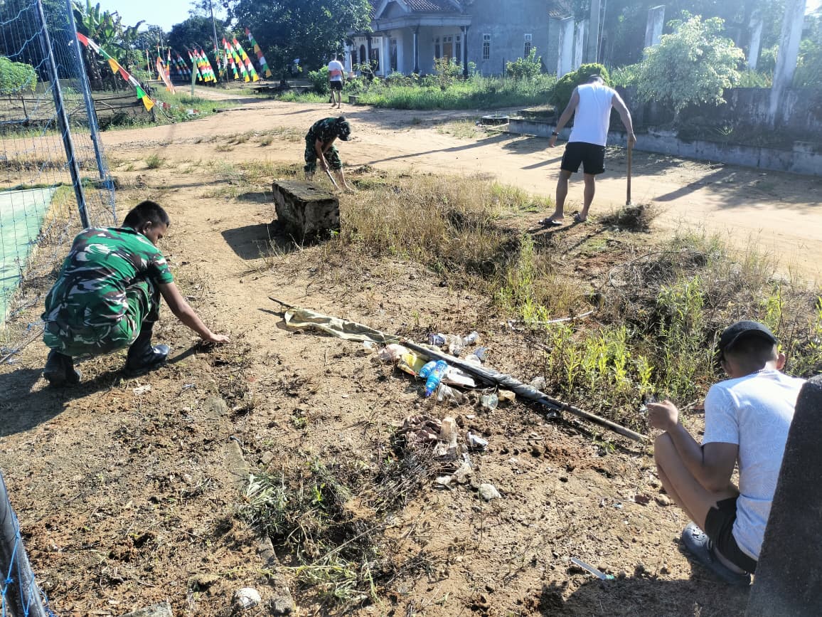 OKI — Dalam rangka mendukung terciptanya lingkungan yang bersih dan sehat, Satgas TMMD Kodim 0402/OKI bersama masyarakat melaksanakan kegiatan pembersihan pangkalan Desa Pematang Sukatani, Minggu (26/4/2026).