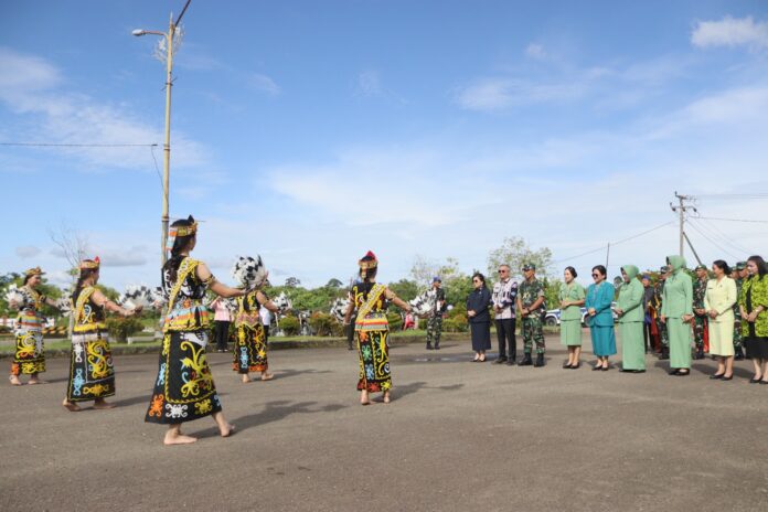 Setibanya di Makodim 0910/Malinau, rombongan Danrem disambut hangat dengan tarian adat Dayak dan pengalungan manik khas Kalimantan Utara. Suasana penyambutan berlangsung meriah dan penuh keakraban.