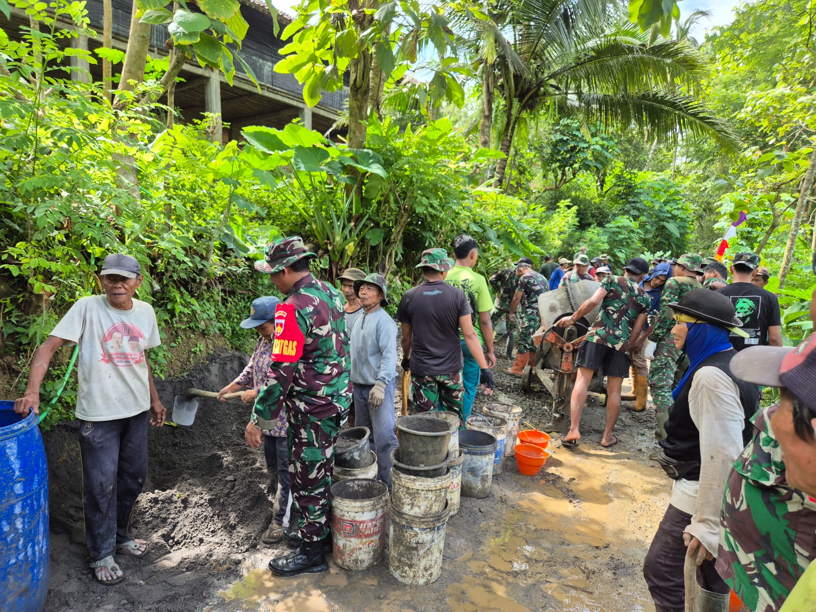 Komandan Kodim 0709/Kebumen, Letkol Inf Eko Majlistyawan Prihantono S.H., M.I.P., turun langsung ke lapangan menyapa para prajurit Satgas TMMD dan masyarakat yang sedang berjibaku mengaduk semen dan meratakan beton demi terwujudnya jalan impian warga desa.