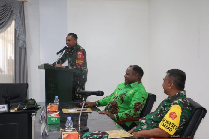 Wamena – Komandan Kodim 1702/Jayawijaya Letkol Arh Reza Ch. A. Mamoribo, S.E., M.Han., selaku Komandan Satuan Tugas (Dansatgas) TNI Manunggal Membangun Desa (TMMD) ke-126, menyambut kunjungan kerja Kepala Kelompok Staf Ahli (Kapoksahli) Danpusterad selaku Ketua Tim Pengawasan dan Evaluasi (Wasev) TMMD, Brigadir Jenderal TNI Raja Benny Arifin, beserta rombongan di Bandar Udara Wamena, Kabupaten Jayawijaya, Provinsi Papua Pegunungan, Kamis (23/10/2025).