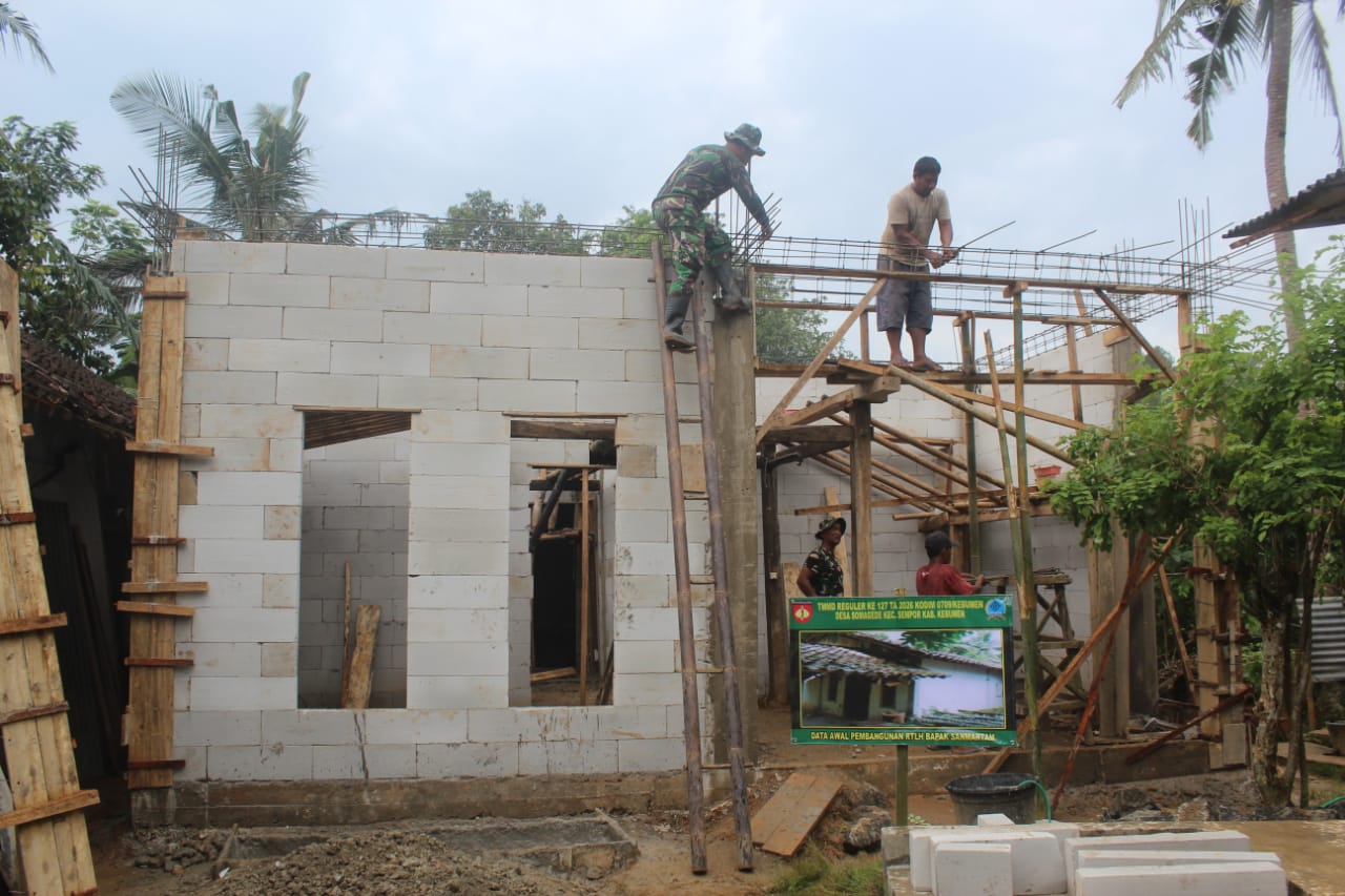 Kebumen – Di tengah deru palu dan adukan semen, semangat pengabdian TNI kembali bergema di Desa Somagede, Kecamatan Sempor. Kamis (12/02/2026), anggota Satgas TMMD Reguler ke-127 Kodim 0709/Kebumen menunjukkan aksi nyata sebagai prajurit pembangun negeri dengan bekerja cekatan dalam pembangunan Rumah Tidak Layak Huni (RTLH) milik Bapak Sanmartam.