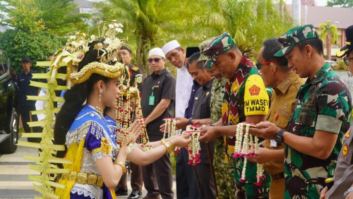 Amuntai – Suasana hangat, semarak, dan penuh kebersamaan mewarnai kedatangan Tim Pengawasan dan Evaluasi (Wasev) TNI Manunggal Membangun Desa (TMMD) ke-127 di Amuntai, Selasa (03/03/2026). Tim Wasev yang dipimpin Kolonel Inf Amarullah, S.H., disambut langsung oleh Forum Koordinasi Pimpinan Daerah (Forkopimda) Kabupaten Hulu Sungai Utara, diawali penampilan tarian daerah khas Banjar sebagai simbol penghormatan sekaligus kearifan lokal.