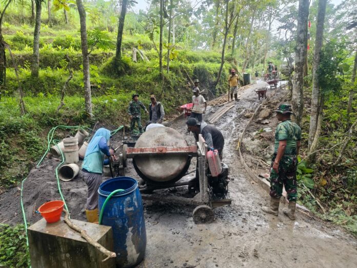 Meski langit tampak muram dan tanah mulai lembap, para prajurit dan warga bahu-membahu melanjutkan pekerjaan. Cangkul terus bergerak, adukan semen tetap diputar, dan semangat gotong royong justru semakin terasa hangat di tengah dinginnya cuaca.