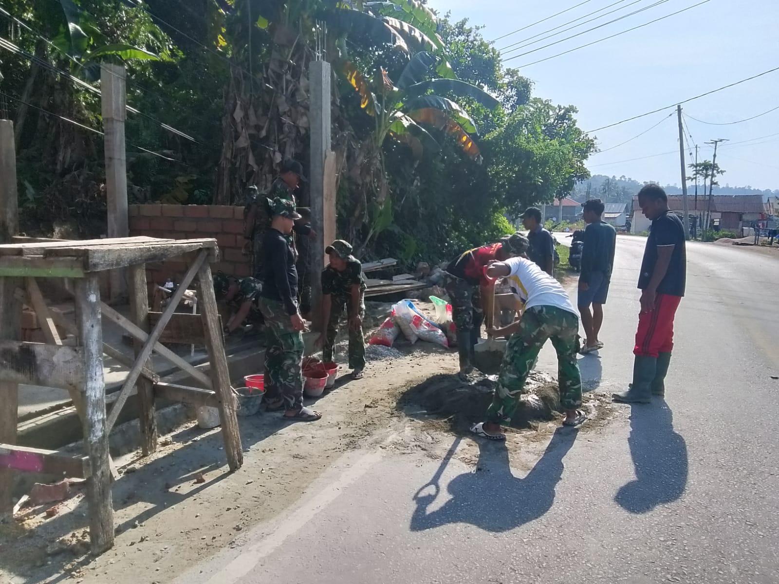 Dalam aksi nyata ini, terlihat sinergi yang kuat antara prajurit TNI dan warga saat memasang dinding batako dan mengaduk semen di lokasi pembangunan.