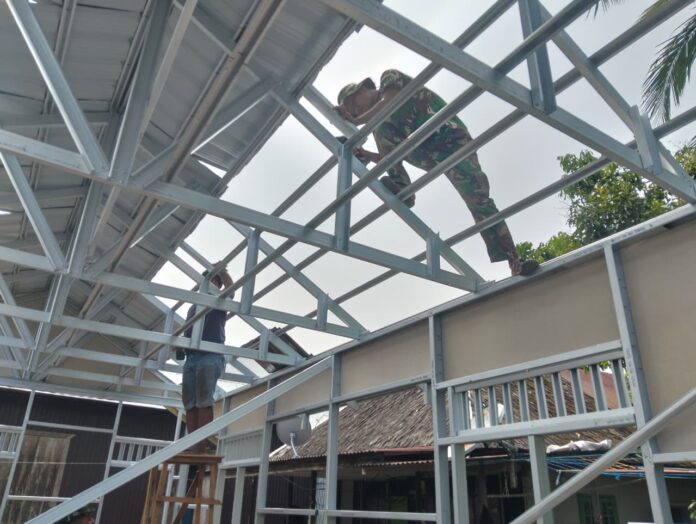 Amuntai – Program TNI Manunggal Membangun Desa (TMMD) ke-127 Tahun Anggaran 2026 yang dilaksanakan Kodim 1001/Hulu Sungai Utara–Balangan terus menunjukkan komitmennya dalam membantu masyarakat kurang mampu. Salah satu sasaran fisik berupa rehabilitasi Rumah Tidak Layak Huni (RTLH) milik Nenek Jumiati kini telah memasuki tahapan penting, yakni pemasangan rangka atap rumah.