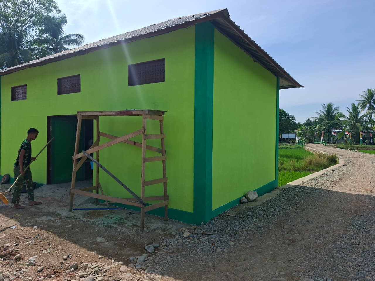 Personel Satgas TMMD bersama masyarakat setempat bahu-membahu menyelesaikan pekerjaan renovasi tersebut. Kebersamaan antara TNI dan warga terlihat jelas selama proses pengerjaan, mulai dari perbaikan struktur bangunan hingga penataan bagian dalam gudang.