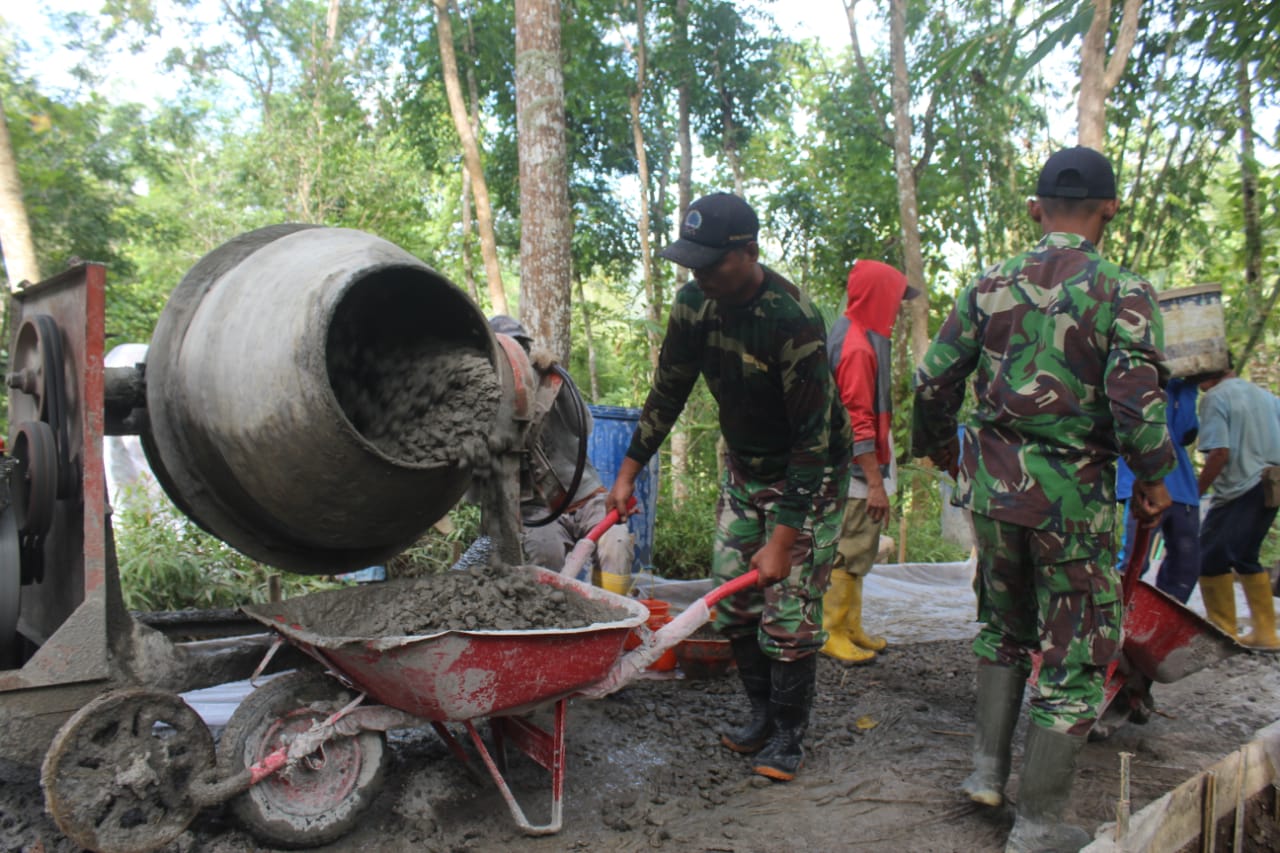 Sejak pagi hari, anggota Satgas TMMD dan warga sudah memadati lokasi pembangunan. Tanpa mengenal lelah, mereka mengangkat material, mengaduk semen, hingga meratakan cor beton secara bergantian. Keringat yang menetes menjadi saksi tekad bersama untuk menghadirkan jalan desa yang kokoh demi menunjang aktivitas dan perekonomian warga.