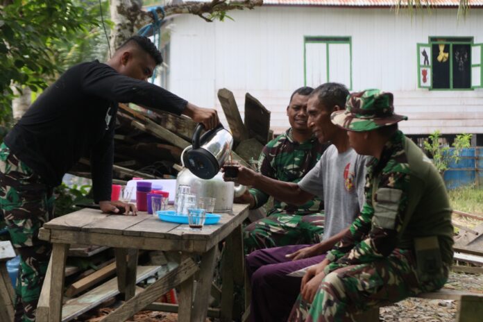 “Ini bentuk kebersamaan kami dengan warga. Meski hanya secangkir kopi, tapi bisa mempererat hubungan antara TNI dan masyarakat,” ujar salah satu anggota Satgas.