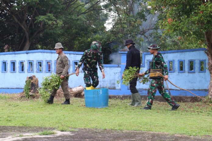 Kegiatan ini melibatkan personel TNI yang tergabung dalam Satgas TMMD bersama perangkat kecamatan dan masyarakat sekitar. Dengan penuh semangat, mereka bahu membahu membersihkan halaman, memotong rumput liar, serta merapikan lingkungan kantor.