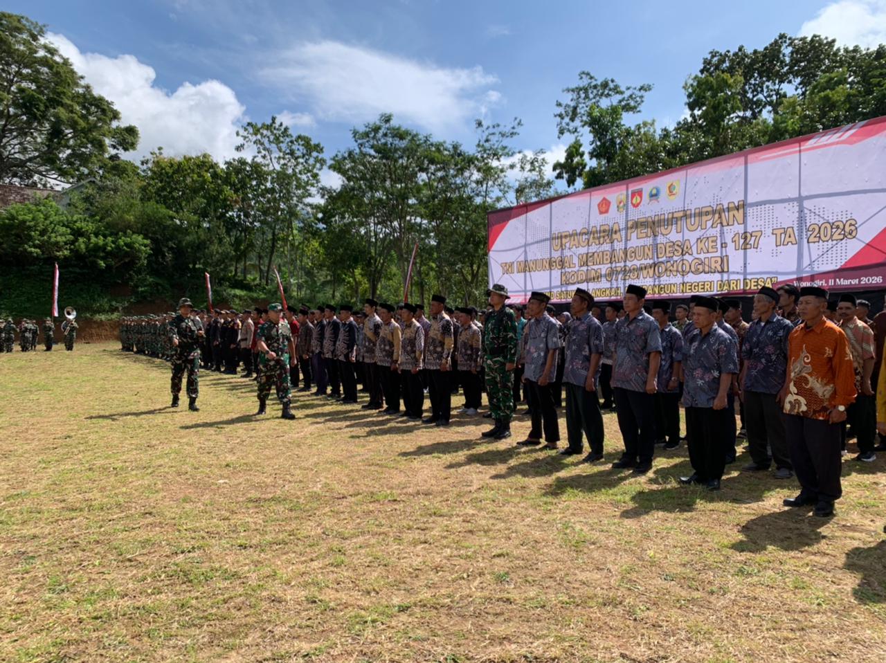 Upacara penutupan berlangsung khidmat dan penuh makna, dihadiri oleh Komandan Korem 074/Warastratama Kolonel Inf Muhammad Arry Yudhistira, Komandan Kodim 0728/Wonogiri Letkol Inf Rodricho Ivan Pattihahuan selaku Dansatgas TMMD, Bupati Wonogiri Setyo Sukarno, jajaran Forkopimda, Fotkopincam, serta ratusan prajurit TNI, Polri, dan warga masyarakat setempat.