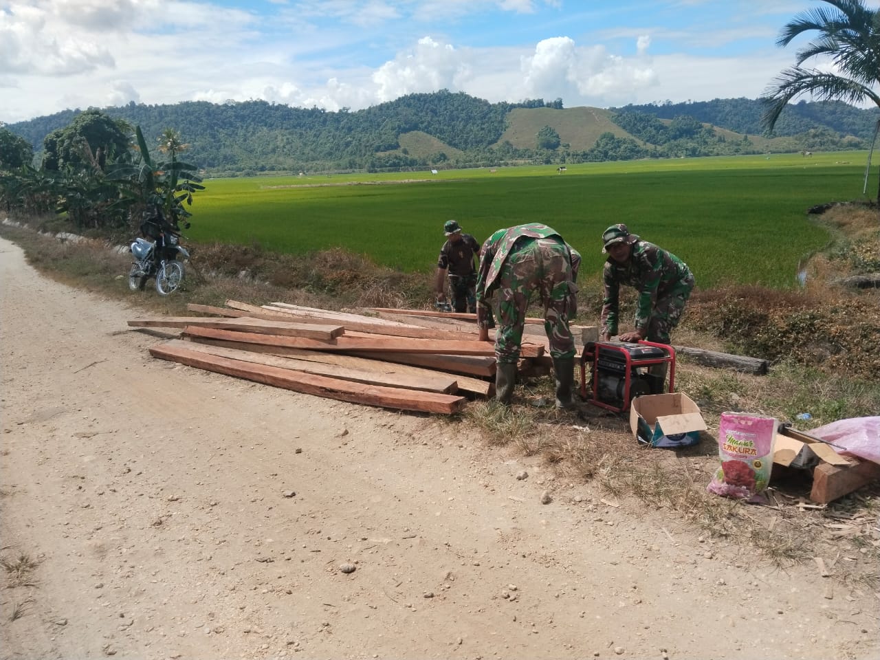 Dan SST Lettu Inf Iswari mengatakan material kayu diturunkan untuk melanjutkan proses pengerjaan jembatan sehingga dapat dikerjakan dengan cepat. “Sebelum di lakukan pemasangan pada jembatan, kayu tersebut dihaluskan terlebih dahulu dengan menggunakan alat mesin ketam kayu agar hasilnya rapih,” ujarnya.