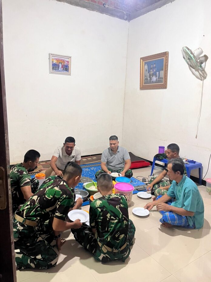 BANYUASIN – Keakraban terlihat antara anggota Satuan Tugas (Satgas) TNI Manunggal Membangun Desa (TMMD) ke-127 dengan warga Desa Wonosari, Kecamatan Pulau Rimau, Kabupaten Banyuasin. Salah satu momen yang mempererat hubungan ini adalah kebiasaan makan bersama yang rutin dilakukan bersama tuan rumah, Bapak Sikun. Rabu (18/2).