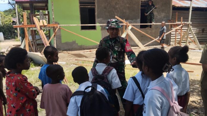 SORONG – Ketika siang hari diiringi suasana hembusan angin pada kesempatan istirahat Danramil 1802-03/Salawati Kapten Inf Semba selaku Dan SSK TMMD KE – 124 Kodim 1802/Sorong meluangkan waktu untuk berkomunikasi sosial bersama anak anak SD Immanuel Yeflio yang baru saja pulang sekolah. Provinsi Papua Barat Daya. Senin (12/05/2025).