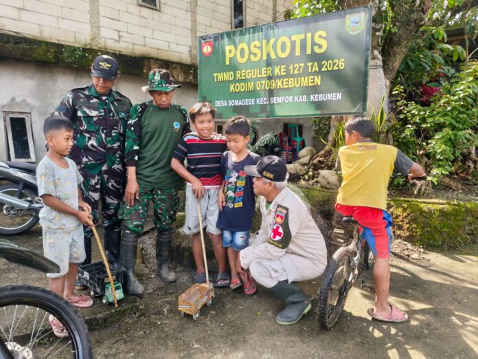 KEBUMEN — Pagi di Desa Somagede, Kecamatan Sempor, Kabupaten Kebumen, Sabtu (28/02/2026), turun dengan teduh yang menenangkan. Kabut tipis masih menggantung di atas pematang, ketika suasana Pos Komando Taktis (Poskotis) TMMD perlahan berubah riuh oleh langkah-langkah kecil yang berlarian mendekat.
