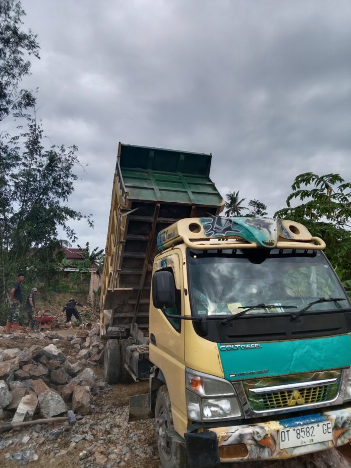 Kerja sama antara personel Satgas TMMD dan masyarakat setempat menjadi motor penggerak utama dalam percepatan distribusi material di lapangan.