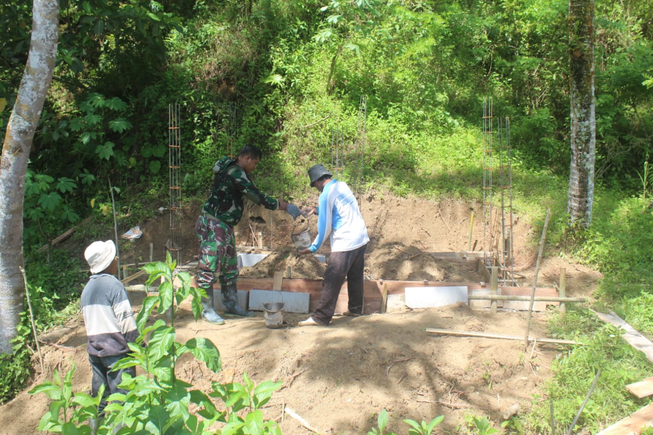 Dengan penuh ketelitian, para prajurit bersama warga bergotong royong menyusun batu, mencampur adukan semen, dan memperkuat pondasi agar bak air berdiri kokoh. Keringat yang jatuh di setiap adukan menjadi simbol semangat kebersamaan dalam menghadirkan harapan baru bagi warga.