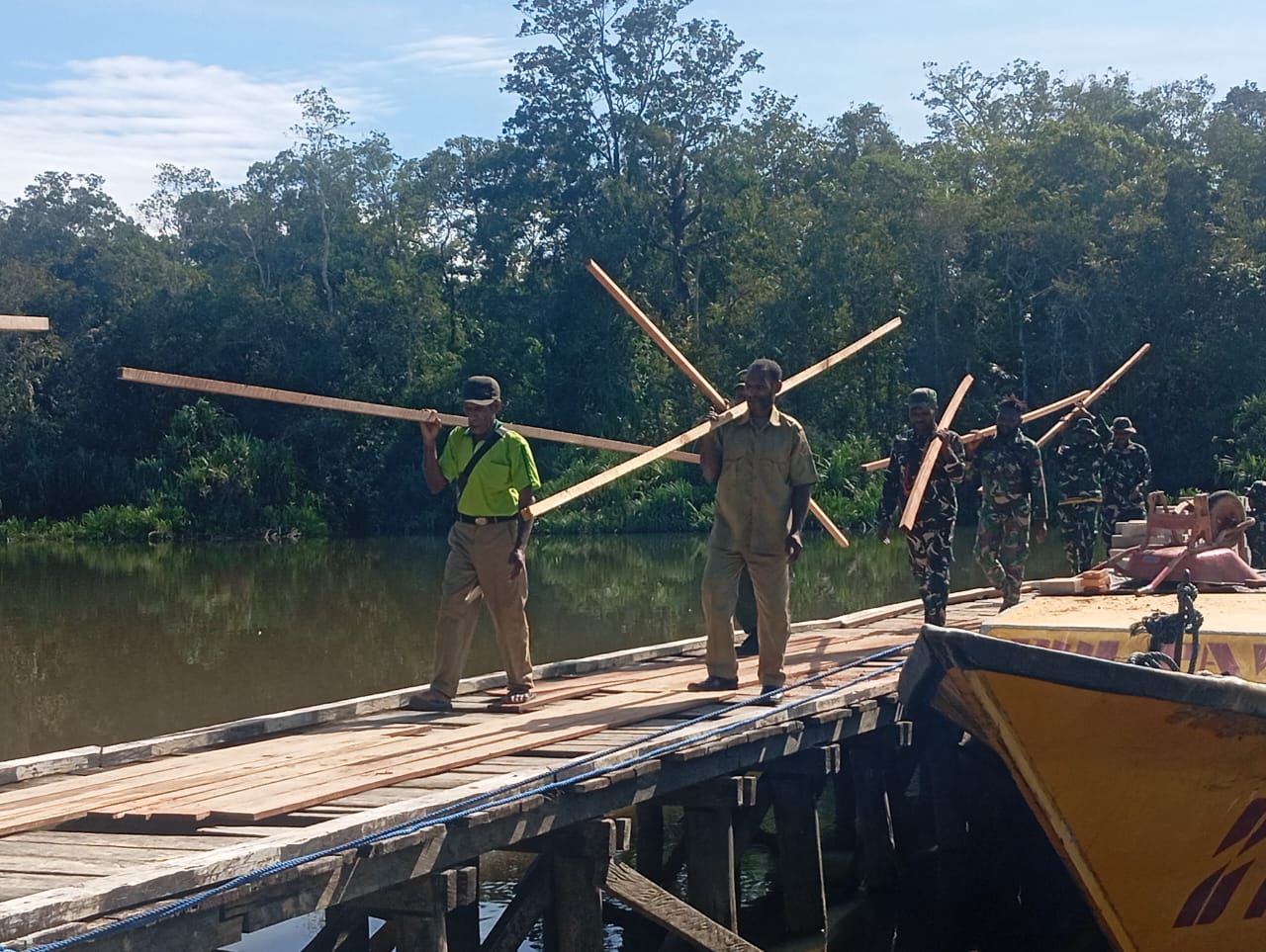 Material bangunan harus diangkut melalui sungai menggunakan kapal kayu, kemudian dipindahkan ke darat dan diangkut menuju lokasi pembangunan menggunakan peralatan sederhana. Meskipun menghadapi tantangan yang berat, Satgas TMMD dan masyarakat tetap semangat dalam melaksanakan tugas.