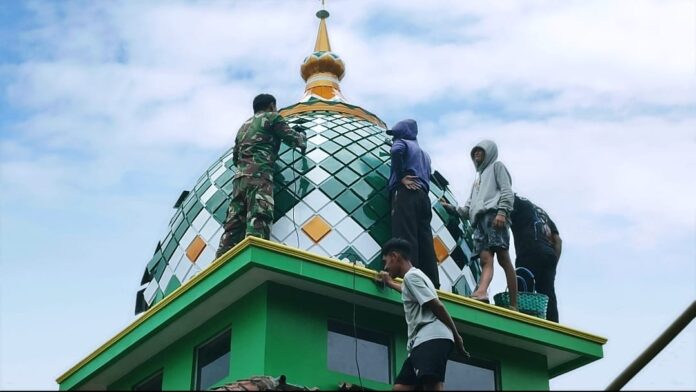 ‎Proses pemasangan kubah dilakukan dengan penuh kehati-hatian dan gotong royong. Sejumlah prajurit TNI bekerja sama dengan warga menaikkan kubah menggunakan tangga. Sementara di bagian bawah, warga lain ikut membantu menyiapkan bagian yang lain serta memastikan setiap tahap berjalan aman dan lancar. Suasana kerja penuh semangat dan canda tawa membuat kegiatan tersebut terasa hangat di tengah teriknya sinar matahari.