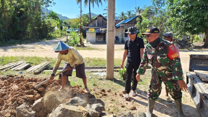 Konawe _ Anggota Satgas TMMD (Tentara Manunggal Membangun Desa) 125 Kodim 1417/Kendari bersama warga seringkali terlihat bekerja bersama-sama, termasuk dalam kegiatan mencampur aduk semen menggunakan sekop untuk proyek pembangunan fisik.