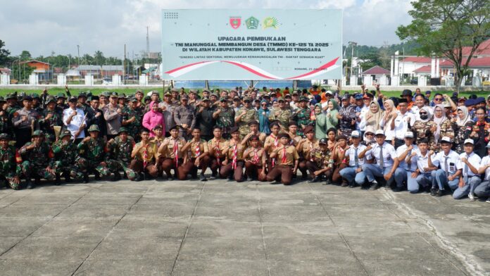 Konawe – Suasana upacara pembukaan TMMD 125 Kodim 1417/Kendari TA 2025 di Kab. Konawe semakin meriah dengan kehadiran anak-anak sekolah yang ikut meriahkan acara tersebut. Anak-anak sekolah pun ikut meriahkan Pembukaan TMMD 125 kodim 1417/Kendari dengan mengenakan pakaian adat dan membawa bendera merah putih.