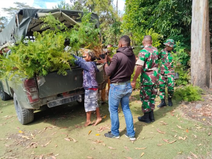 Wamena – Dalam rangka mendukung pelestarian lingkungan dan menjaga keseimbangan alam, Satgas TNI Manunggal Membangun Desa (TMMD) ke-126 Kodim 1702/Jayawijaya menyiapkan ratusan bibit pohon keras untuk kegiatan penghijauan di lokasi TMMD.