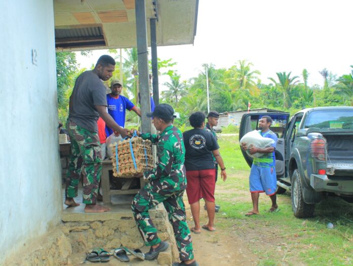 Sarmi – Satgas TMMD ke-123 Kodim 1712/Sarmi Sejak dari Pembukaan TMMD hingga saat ini kembali menunjukkan kepeduliannya terhadap kesejahteraan masyarakat dengan menyalurkan bantuan makanan kepada warga Kampung Podena, Distrik Bonggo, Kabupaten Sarmi, Papua. Senin ( 24/02/2025).