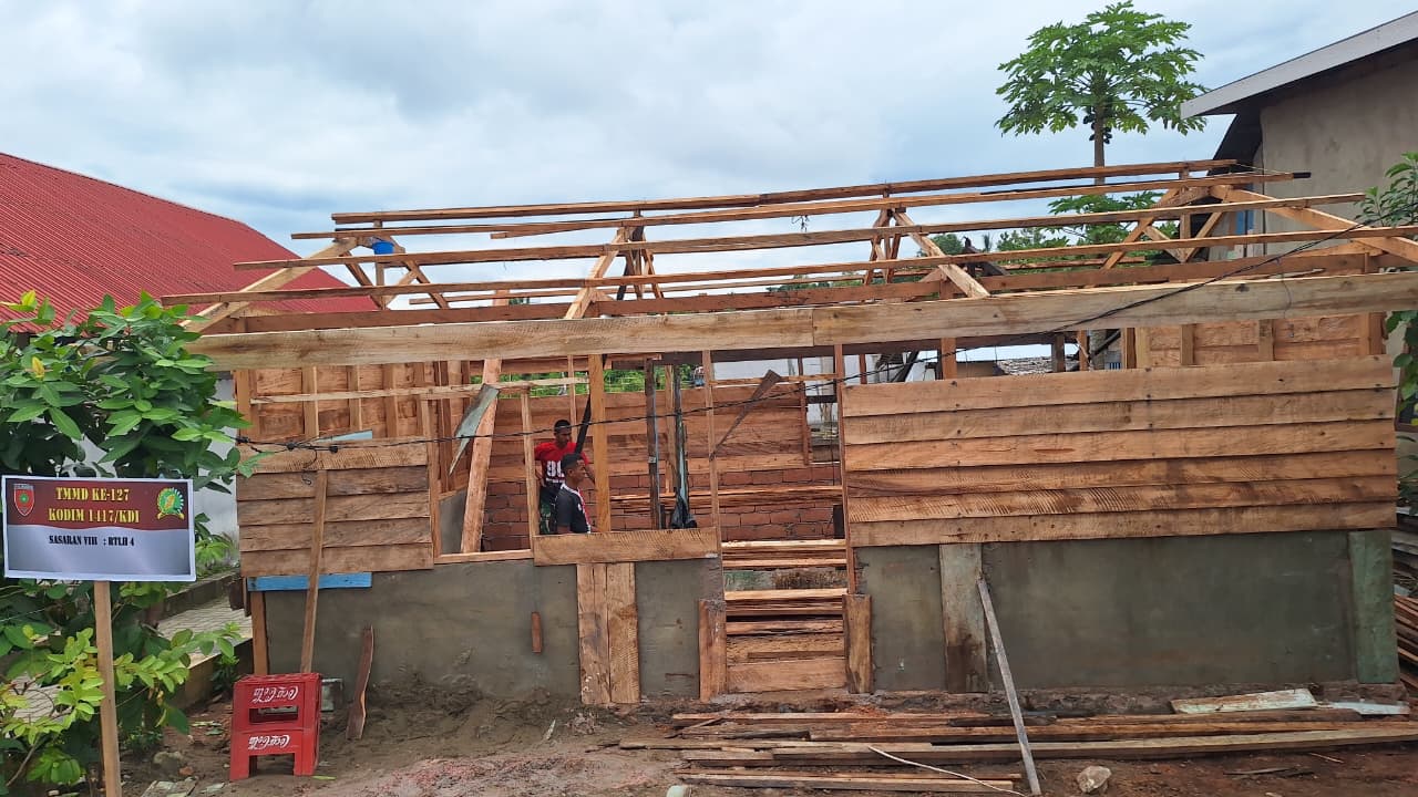 Kendari – Harapan warga Kelurahan Petoaha untuk memiliki hunian yang lebih layak kini tinggal selangkah lagi. Memasuki hari Minggu (1/3), progres pengerjaan sasaran Rumah Tidak Layak Huni (RTLH) dalam program TMMD ke-127 Kodim 1417/Kendari menunjukkan kemajuan signifikan dengan capaian fisik sebesar 90%.