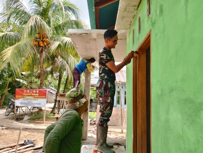 Kuantan Singingi – Pembangunan rumah layak huni sasaran kedua dalam rangka TMMD ke-127 Tahun 2026 di Desa Tanjung, Kecamatan Kuantan Hilir Seberang, Kabupaten Kuantan Singingi, menunjukkan progres yang semakin mendekati penyelesaian. Bertempat di rumah milik Ibu Baida, RT 006 RW 003, anggota Satgas TMMD bersama masyarakat setempat melaksanakan kegiatan pemasangan instalasi listrik, pengecatan kusen jendela dan pintu, serta pengecatan dinding rumah. Minggu (8/3).