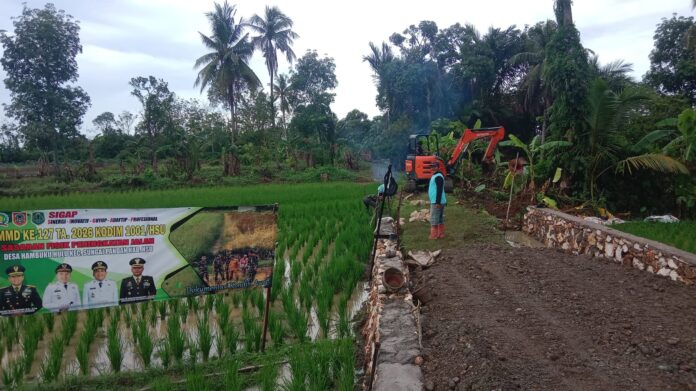 Amuntai – Pembangunan jalan usaha tani oleh Satgas TMMD ke 127 Kodim 1001/HSU di Desa Hambuku Hulu, Kecamatan Sungai Pandan, Kabupaten Hulu Sungai Utara, mulai memasuki tahap pengerjaan fisik. Jalan sepanjang ±200 meter dengan lebar 6 meter ini kini mulai diratakan menggunakan alat berat untuk mempercepat proses.Sabtu (21/02/2026)