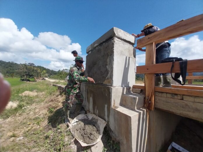 KONAWE – Setelah pagar jembatan rampung, anggota Satgas TMMD 125 Kodim 1417/Kendari melanjutkan proses plamir dengan menghaluskan permukaan beton jembatan sebelum di cat, di Desa Awua Jaya, Kec. Asinua, Kab. Konawe, Sabtu (2/8).