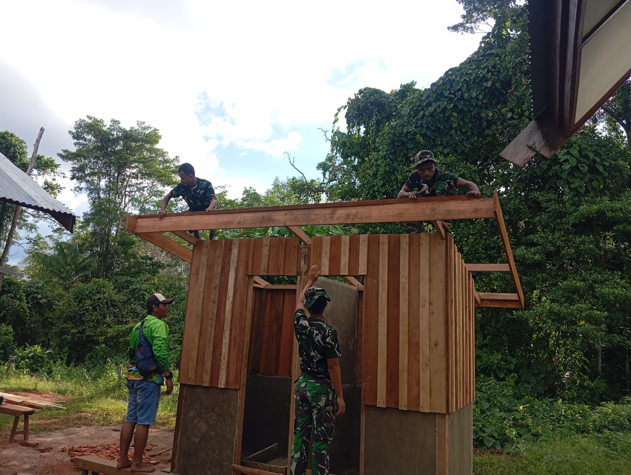 Satgas TMMD dengan cekatan memasang resplang di bagian atas dinding MCK. Resplang ini berfungsi sebagai penutup bagian atas dinding dan memberikan tampilan yang lebih rapi dan estetis. Pemasangan resplang ini merupakan tahapan penting dalam penyelesaian pembangunan MCK.