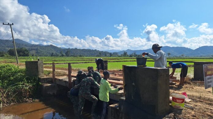 KONAWE – Semangat personil TNI bersama anggota Polri dan masyarakat menyatu dalam proses pembangunan infrastruktur di daerah pedesaan. Seperti yang dilakukan personil TNI dan Polri yang tergabung dalam Satgas TMMD 125 Kodim 1417/Kendari bersama masyarakat membangun nilai infrastruktur termasuk jembatan, di Desa Awua Jaya, Kec. Asinua, Kab. Konawe, Rabu (30/7).
