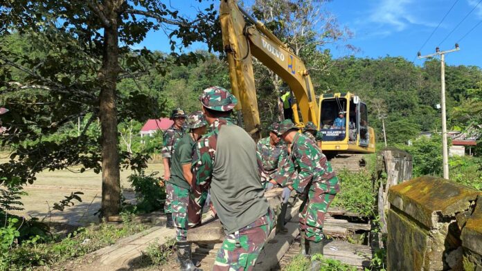 Kendari – Jembatan lama yang sudah rusak di Desa Nekudu, Kecamatan Asinua, Kabupaten Konawe, dibongkar oleh alat berat TMMD 125 Kodim 1417/Kendari yang dipimpin oleh Dan SST Lettu Inf Iswari. Pembongkaran jembatan lama ini dilakukan untuk mempercepat proses pembangunan jembatan baru yang lebih baik dan aman.