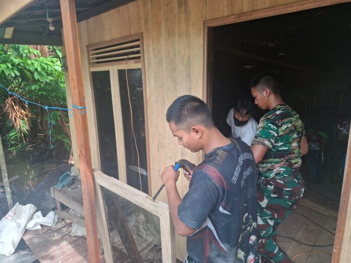 Sejak pagi hari, anggota Satgas TMMD bersama warga setempat bahu membahu melaksanakan berbagai tahapan pekerjaan, mulai dari pemasangan rangka, perbaikan dinding, hingga penataan struktur bangunan agar lebih kokoh dan layak huni. Kekompakan antara TNI dan masyarakat terlihat jelas di lapangan, mencerminkan kemanunggalan yang menjadi ruh utama pelaksanaan TMMD.