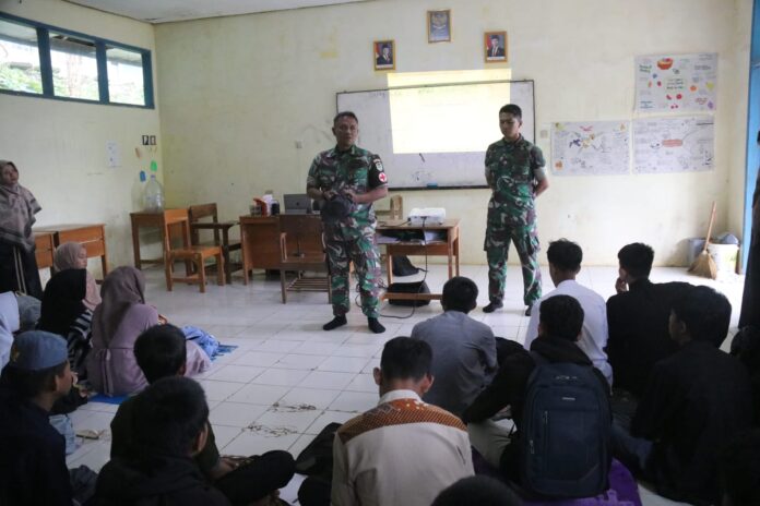 Cipelah, Kab. Bandung – Satuan Tugas (Satgas) TNI Manunggal Membangun Desa (TMMD) Reguler Ke-127 Kodim 0624/Kab. Bandung tidak hanya fokus pada pembangunan fisik, tetapi juga memberikan perhatian pada pembangunan karakter dan kualitas hidup masyarakat. Pada hari Rabu, 25 Februari 2026, anggota Satgas TMMD melaksanakan kegiatan non-fisik berupa pemberian materi wawasan kebangsaan (Wasbang), penerapan hidup disiplin, pencegahan tindakan bullying, serta sosialisasi Perilaku Hidup Bersih dan Sehat (PHBS) kepada pelajar siswa kelas 11 SMK Negeri 1 Rancabali, yang berlokasi di Jalan Pahlawan Desa Cipelah, Kecamatan Rancabali.