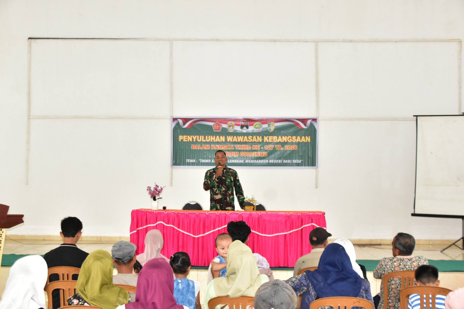 Kuantan Singingi – Program TNI Manunggal Membangun Desa (TMMD) ke-127 Kodim 0302/Inhu tidak hanya fokus pada pembangunan fisik, tetapi juga pada penguatan nilai-nilai kebangsaan di tengah masyarakat. Dalam rangka mendukung program non fisik TMMD ke-127, Kodim 0302/Inhu menggelar kegiatan penyuluhan Wawasan Kebangsaan (Wasbang) yang bertempat di aula kantor Camat Kuantan Hilir, Kabupaten Kuantan Singingi, pada Jumat (20/02/2026).