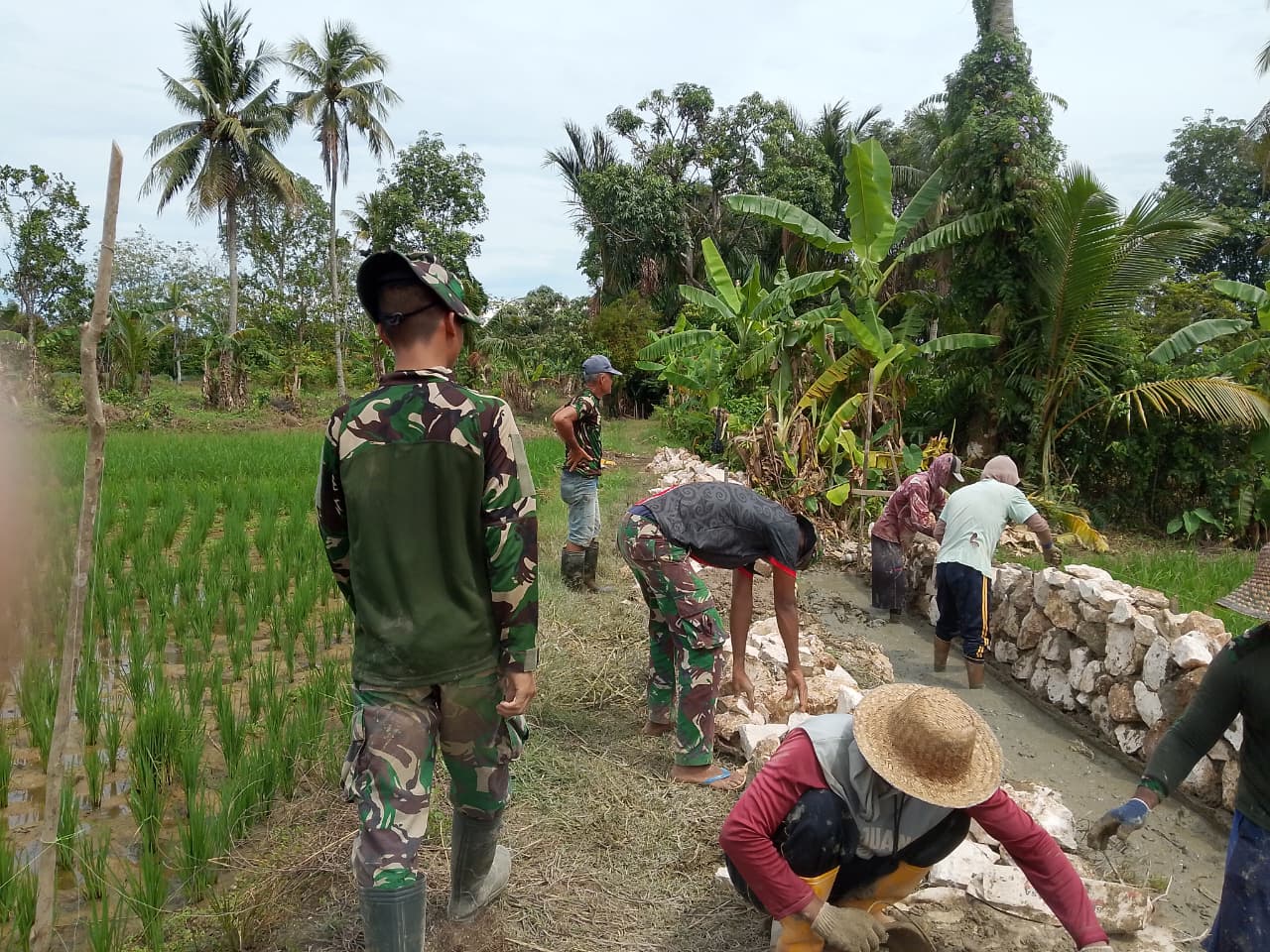 Personel Satgas TMMD bersama masyarakat setempat bahu membahu menyelesaikan pekerjaan dengan semangat gotong royong. Sinergi antara TNI dan warga menjadi kunci utama dalam percepatan pengerjaan di lapangan.
