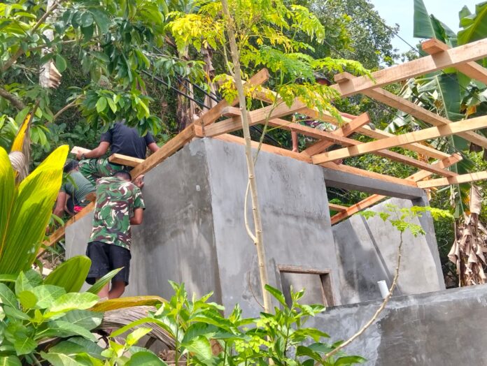 Kendari – Memasuki fase krusial pembangunan, Satuan Tugas (Satgas) TMMD ke-127 Kodim 1417/Kendari kini tengah memfokuskan pengerjaan pada bagian atas bangunan MCK di Kelurahan Sambuli. Pada Selasa (3/3).