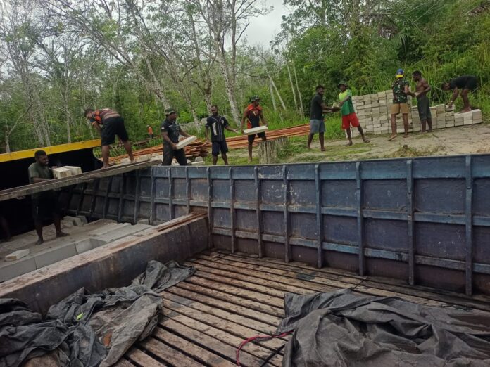 Satgas Kodim 1704/Mappi Gotong Royong Angkut Material Bangunan dari Dermaga ke Lokasi Pembangunan di Yibin