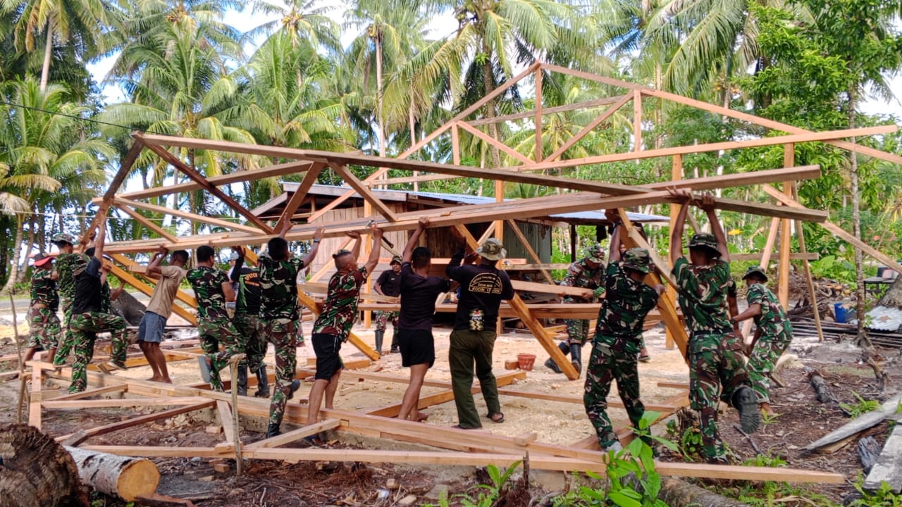 Satgas TMMD 128 Kodim 1708/BN bekerja bahu-membahu dengan masyarakat setempat. Mereka saling bahu-membahu mengangkat, menopang, dan memasang balok-balok kayu untuk membentuk kerangka bangunan. Suasana kerja terlihat sangat dinamis dan penuh semangat, meskipun cuaca cukup panas, namun hal tersebut tidak menyurutkan niat mereka untuk menyelesaikan pekerjaan tepat waktu.