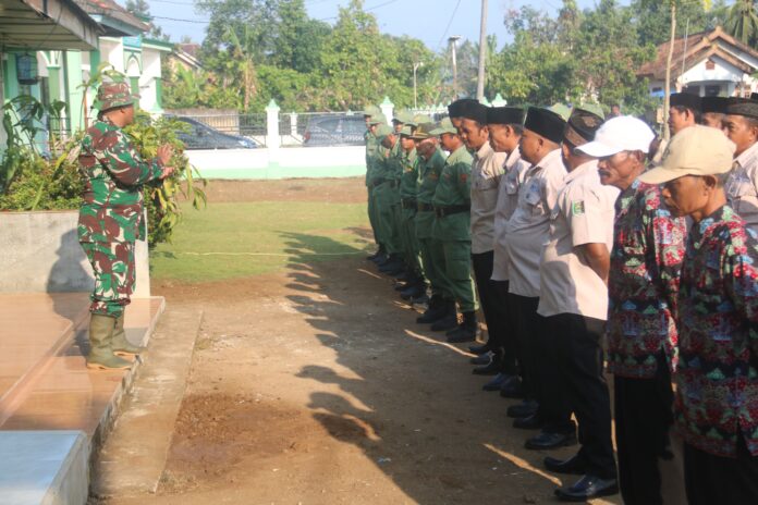 LAMTIM – Anggota Satuan Tugas (Satgas) TNI Manunggal Membangun Desa (TMMD) ke-124 Sertu Irvan Muali memimpin apel pagi perangkat desa Itik Rendai, bertempat di halaman balai desa, Senin (12/5/2025).