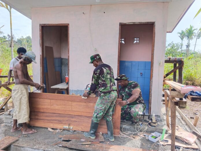 MIMIKA – Pembangunan fasilitas Mandi, Cuci, dan Kakus (MCK), yang menjadi salah satu dari beberapa sasaran fisik program TNI Manunggal Membangun Desa (TMMD) Ke-124 Kodim 1710/Mimika, terus berlanjut. Saat ini, Satgas TMMD bersama warga Kampung Iwaka tengah fokus pada tahap pemasangan pintu MCK, Senin (26/05/2025).
