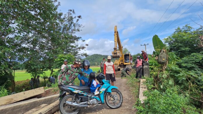 Jembatan yang sedang dikerjakan tersebut ternyata menjadi kendala bagi warga yang ingin menyebrangi sungai untuk mengantar anaknya ke sekolah. Namun, personil Satgas TMMD 125 dengan sigap membantu warga tersebut dengan menyediakan bantuan untuk menyebrangi jembatan yang sedang dikerjakan.