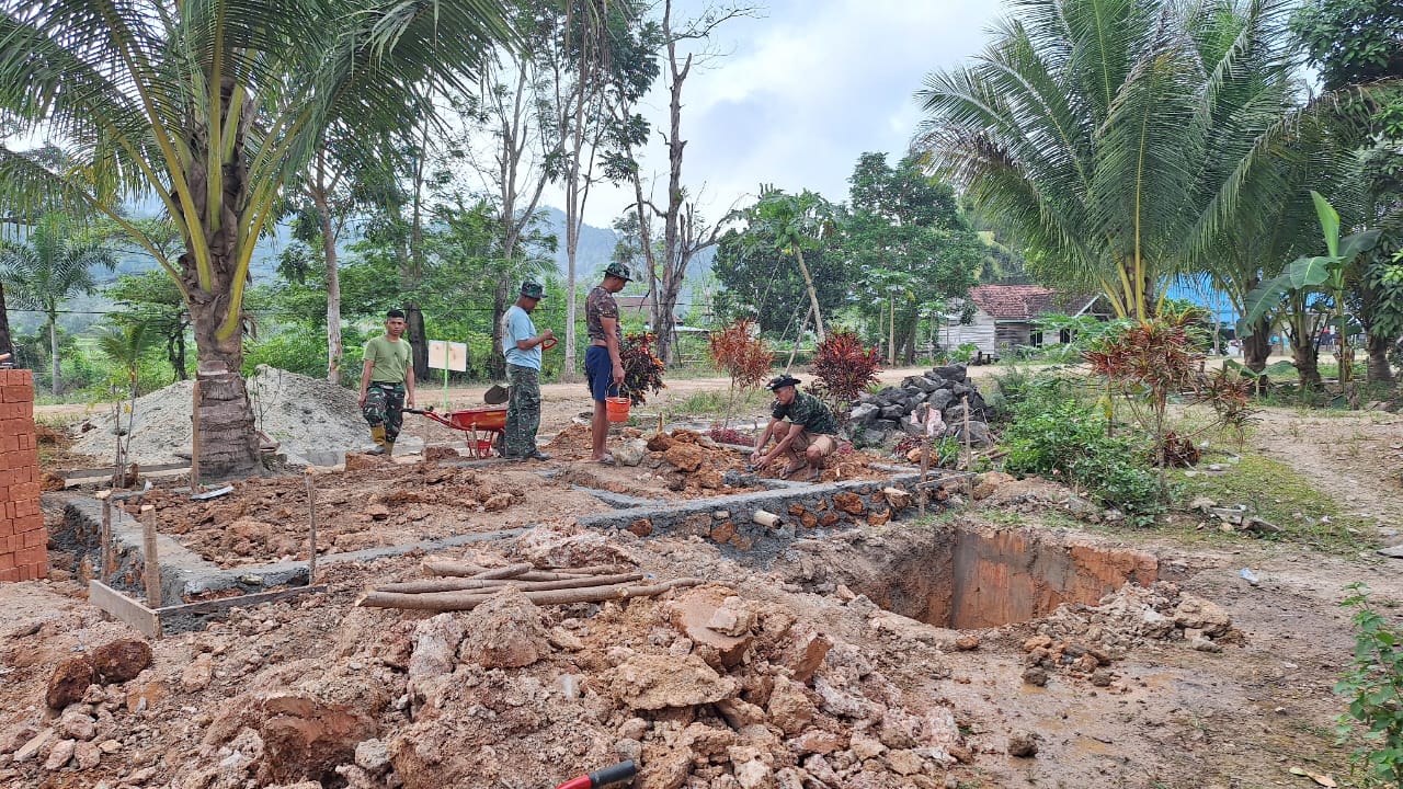 Konawe – Satuan Tugas (Satgas) TNI Manunggal Membangun Desa (TMMD) ke- 125 Kodim 1417/Kendari, mulai memasuki tahap pemasangan pondasi MCK umum, di Desa Nekudu, Kec. Asinua, Kab. Konawe, Sabtu (26/7).