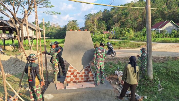 Konawe – Berkat keahlian para anggota Satgas TMMD, tugu TMMD 125 Kodim 1417/Kendari memasuki tahap plamir dengan bahan acian semen. Tugu tersebut berdiri di pertigaan jalan Desa Awua Jaya, Kec. Asinua, Kab. Konawe, Kamis (14/8).